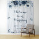 Um letreiro de bem-vindo ao nosso casamento em tapeçaria de floral de aquarela em azul poeirado e marinho, dando as boas-vindas aos seus convidados para o casamento em um fundo azul marinho com caligrafia branca e data numérica.