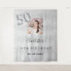 Uma tapeçaria de boas-vindas para uma festa de aniversário de 50 anos glamorosa. Um fundo metálico prateado falso decorado com pó glitter falso. Personalize e adicione uma foto de alta qualidade, nome e data. O número 50 é escrito com uma fonte estilo balão.