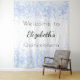 Uma tapeçaria de boas-vindas para uma Quinceañera glamorosa e feminina, festa de 15 anos. Um fundo branco decorado com confetes azul claro e azul bebê. Personalize e adicione um nome e idade. Letras pretas.