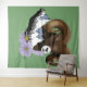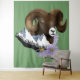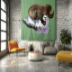 Um retrato de uma ovelha Ram/Bighorn com montanhas e flores roxas num pano de fundo verde