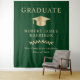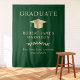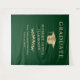 Elegante festa de formatura verde de boas-vindas tapeçarias e pano de fundo de fotos com boné de formando de ouro, "Formando" e o nome do formando, escola e ano de aula em tipografia de ouro clássica.