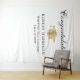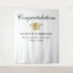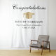 Elegante tapeçaria de boas-vindas à festa de formatura branca e pano de fundo fotográfico com boné de formando de ouro, "Parabéns" em um roteiro clássico de caligrafia e o nome do formando, escola e ano de aula em letras modernas.