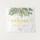 Este sinal de boas-vindas de casamento preto e dourado apresenta eucalipto verde e folhas verdes e douradas. Para personalização mais avançada deste design, por favor clique no link personalizado