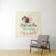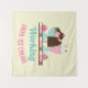 Uma tapeçaria com um ditado engraçado - Trabalhando até o sorvete. Ilustrada com um bar de chocolate, um sundae de 3 scoop com cobertura de chocolate, borrifadas e uma pequena cereja no topo. E um float de morango com chantilly.