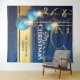 Traga o espírito do Natal para sua casa ou escritório com este lindo gráfico vetorial tridimensional de enfeites de árvore de turbilhão azul e dourado pendurados na ponta de fitas de cetim dourado. Cada bola tem uma luz brilhante e um rastro de poeira mágica de fada leva a partir da de cima em direção à silhueta branca do Papai Noel em seu trenó sendo puxado pelo céu noturno por suas renas. Eles são emoldurados por um fundo azul escuro cheio de neve e têm uma faixa dourada sobre eles. Personalize os modelos com seu cumprimento de Natal, mensagem ou citação personalizados.