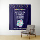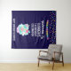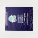 Tapeçaria de aniversário com uma ilustração fofa apresentando um bolo e sorvete sorrindo de alegria. Um arco-íris e corações rodeiam o desenho. Uma nuvem fofa e fofa também está sorrindo de felicidade. O bolo e o sorvete têm um chifre de unicórnio na moda no topo. Design fofo e adorável cheio de alegria. Confetes coloridos e uma faixa de bandeirolas ao longo da parte superior em um fundo roxo escuro.