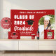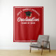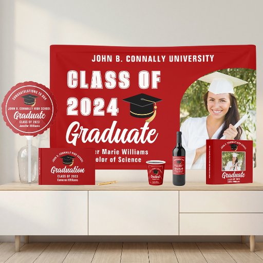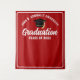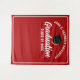 Esta tapeçaria moderna de festa de formatura vermelha e branca apresenta a tipografia clássica do seu segundo grau ou nome da faculdade para a classe de 2025. Personalize este cenário de fotos com seu ano de graduação, com o script de chic manuscrito e boné de formando preto para decoração personalizada de formando de excelente.