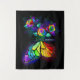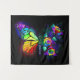 Arco-íris, borboleta monarca luminosa, pintada artisticamente com buquê de rosas iridescentes, brilhantes e luminescentes sobre fundo preto. Borboleta-arco-íris.