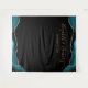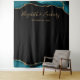 Esta elegante tapeçaria de cabine de fotos de casamento apresenta uma borda de ágata em tons de azul-turquesa e dourado na parte superior e inferior sobre um fundo preto. Personalize-a com os nomes dos noivos em uma fonte manuscrita dourada seguida pela data.