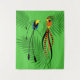 Arte vetorial colorida de um par de aves exóticas ficcionais do paraíso com penas longas de cauda e plumagem brilhante numa selva verde como o fundo.