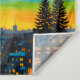 Uma cena noturna mesmerante com um horizonte brilhante da cidade debaixo de um céu cósmico, cheio de estrelas. As janelas do ouro contrastam lindamente com os azuis e verdes profundos da noite. Uma rodovia e pinças em torre adicionam profundidade a esta paisagem urbana serena.