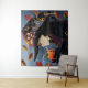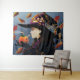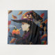 A bruxa-morena bonita toda vestida de laranja, roxo e preto. Duas amigas com ela... um ratinho e uma abóbora bebê dando uma melhor olhada nela. Folhas do outono caindo ao redor delas.