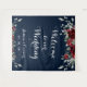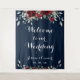 Um letreiro de tapeçaria de boas-vindas ao nosso casamento com flores em aquarela burgundy dando boas-vindas aos seus convidados para o seu casamento contra um fundo preto com escrita em letra cursiva bonita e branca.