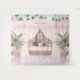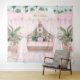 Este fundo de foto apresenta uma fileira de cabanas de piscina listradas de rosa e branco com plantas tropicais e almofadas de folhas tropicais combinando. A cabana central pode ser personalizada com um nome. Perfeito para um fotobooth de festa de piscina.