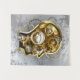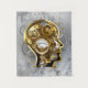 Cabeça conceitual, mecânica, humana com manômetro antigo e engrenagens metálicas contra fundo industrial das cinzas. Estilo Steampunk.
