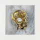 Cabeça conceitual, mecânica, humana com manômetro antigo e engrenagens metálicas contra fundo industrial das cinzas. Estilo Steampunk.