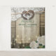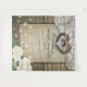 Pano de Fundo para Chá de Noiva / Casamento em Estilo Rústico Country - Casal com Coração de Ferradura Antiga com Laço de Corda e Renda Branca, Flor de Hidrangeia, Luzes de Corda e Tecido de Sarjão em Fundo de Madeira de Celeiro Antigo.