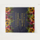 Buquês de girassóis amarelos dourados e rosas burgundy vermelho-escuro nas bordas em um fundo azul-marinho escuro da meia-noite com seu script personalizado em tipografia dourada falsa criando um belo fundo rústico de cabine de fotos para casamento. ++++++++++ Fácil de personalizar e perfeito para casamentos temáticos rústicos vintage tradicionais de final de verão, outono ou inverno.