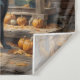 Um belo Labrador Retriever negro senta-se em frente a uma cabana acolchoada na floresta no outono