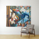 O gato Calico brincando com um dragão chinês vermelho em frente a uma janela de vidro colorido de pavão.