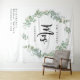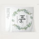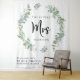 Uma tapeçaria elegante para o fundo da câmera de fotos no seu chá de noiva, apresentando uma grinalda em verde-sage em aquarela com folhagem de eucalipto e "A Futura Sra" em uma grande letra cursiva e tipografia moderna. Personalize com os nomes de solteira e casada da noiva e data do chá. Um canto inferior é deixado em branco para que seus convidados tirem fotos.