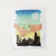 Casal de aquarela promete vista da paisagem urbana, promessa cor-de-rosa, juramento com o mindinho, eu juro impressão, casal apaixonado, ideia de presente do dia dos namorados, fundo com cores azul e amarelo