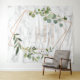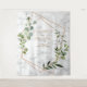 Moderno e elegante, este design de tapeçaria de casamento apresenta um geométrico de cobre falso decorado com verde de eucalipto em aquarela sobre uma textura de mármore branco falso. Os nomes do casal e detalhes do casamento estão numa cor de cobre que combina. Direitos autorais da Elegant Invites. Todos os direitos reservados.