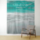 Decoração temática de casamento na praia turquesa branca costeira. Tapete de fundo da cabine de fotos da recepção tropical das ondas do oceano de verão náutico. Banner personalizado lindo, chique, moderno, legal, elegante. Sr. e Sra., nomes e data tipografia branca podem ser alterados. Direitos autorais da imagem Marg Seregelyi Photography.