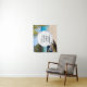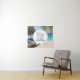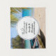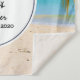 Uma tapeçaria de boas-vindas de casamento com uma cena idílica de praia tropical. Água cristalina azul turquesa e uma praia de areia marrom suave. Algumas folhas de palmeira penduradas de cima. Um velho barco de remos de madeira está na praia. Uma paisagem serena e pacífica.