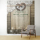 Fundo de Estilo Rústico Country para Chuveiro de Noiva / Casamento Photo Booth - Casal com Ferradura Antiga e Coração com Laço de Corda e Renda Branca, Girassol, Luzes de Corda e Tecido de Sarjão sobre Fundo de Madeira de Celeiro Antigo.