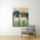 Dois cavalos avistados ficam graciosamente em um vale verde, lavado, banhado no brilho quente de um sol ascensão. Colinas rolantes e lua crescente adicionam uma atmosfera serena e sonhadora à cena. Essa trabalho de arte minimalista, mas vibrante, captura a beleza da natureza e o espírito livre dos cavalos.