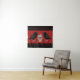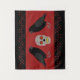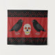 Esta tapeçaria maravilhosa mostra uma imagem gráfica de um crânio com olhos vermelhos e dentes amarelos cobertos de rachaduras. O crânio assustador tem um grande corvo em ambos os lados como um guardião. Os corvos são pretos com pernas de cinza e garras. Eles também têm olhos negros.