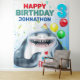 Tubarão corado usando chapéu de festa com balões.