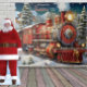 Cena de fundo colorida do trem de Natal para sua festa ou evento corporativo, ótima para fotos com os convidados. Altere o texto para o que desejar ao fazer o pedido.