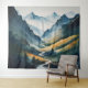Esta tapeçaria horizontal cativante apresenta uma cena de montanha impressionante, formada com mestria em tons de azul suave e bronzeada que evoca um senso de serenidade e admiração. No coração da composição, um riacho cristalino mede graciosamente a montanha abaixo, suas águas refletindo a matiz do céu, criando uma mistura harmoniosa de cores que exalta tranquilidade. As montanhas, representadas em diferentes tons de bronzeado, erguem-se majesticamente contra o pano de fundo, seus picos tocando o céu, sugerindo tanto sua grandiosidade quanto a beleza eterno da natureza.