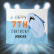 Cenário de aniversário de tubarão para crianças. Placa de aniversário de 7 anos em azul e laranja para decorações de aniversário de menino ou menina de sete anos.