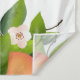 Pêssegos e flores aninhados em folhas verdes.