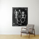 Cenário de casamento de esqueleto dançante com a citação "Até que a morte nos faça festejar", um casal, seus nomes e uma data estabelecida. Decoração para cerimônia, recepção ou festa de casamento em preto e branco. Ótimo para um evento com tema gótico, Halloween, assustador ou sombrio.