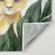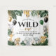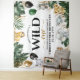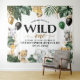 Características do design folhagem de palmeira da selva e folhas de banana decoradas com balões impressos em cores dourado, preto e verde. Os desenhos de balões também apresentam confetes falsos impressos em cor dourada. O modelo também apresenta animais em aquarela de girafa bebê, rinoceronte, elefante, leão, zebra, hipopótamo e preguiça para um tema de safari. Selvagem um é impresso em fontes modernas e da moda.