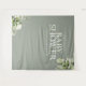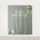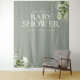 Um pano de fundo elegante para cabine de fotos de chá de bebê, apresentando tipografia moderna e folhagem botânica verde em um fundo verde sálvia neutro em termos de gênero. Criado por Thisisnotme©
