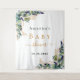Um fundo branco chic. Decorado com folhas de eucalipto pintadas em verde, raminhos, folhagem e folhas de ouro falso. Personalize e adicione o nome da futura mamãe e uma data. Letras pretas e douradas. Pode ser usado como um banner de boas-vindas de chá de bebê, como decoração de parede de festa ou como fundo de cabine de fotos.