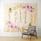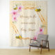 Tapeçaria elegante e divertida para chá de bebê de verão. Fundo amarelo e branco com padrão de melhodo. Com uma moldura geométrica em dourado falso. Decorado com flores tropicais cor-de-rosa, hibiscos e abelhas felizes. Com o texto: Mamãe Abelha e o nome da futura mamãe. Modelo para o nome e uma data. Pode ser usado como decoração de parede para o chá de bebê ou como fundo para fotos.