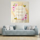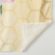 Tapeçaria elegante e divertida para chá de bebê de verão. Fundo amarelo e branco com um padrão de favo de mel. Com uma moldura geométrica em dourado falso. Decorado com flores tropicais cor-de-rosa, hibiscos e abelhas felizes. Com o texto: Mamãe Abelha e o nome da futura mamãe. Modelo para o nome e uma data. Pode ser usado como decoração de parede para o chá de bebê ou como fundo para fotos.
