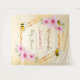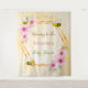 Elegante, divertida, tapeçaria de chá de bebê de verão. Fundo amarelo e branco com um padrão de favo de mel. Com uma moldura geométrica em dourado falso. Decorado com flores tropicais cor-de-rosa, hibiscos e abelhas felizes. Com o texto: Mamãe Abelha e o nome da futura mamãe. Modelo para o nome e uma data. Texto em marrom, rosa e verde. Pode ser usado como decoração de parede para o chá de bebê ou como fundo para fotos.