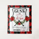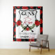 Pano de Fundo do Chá de Bebê Revelação de Gênero Armas ou Rosas. Preto e Branco Vermelho. Rosas vermelhas em cima de uma moldura em forma de crachá com furos de bala legais em volta da moldura de rosas. Ótimo para casais militares ou da aplicação da lei. 2022 Miss SassyParty Designs