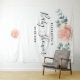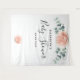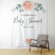 Banner elegante, clássico e moderno de chá de fraldas floral, tapeçaria celebrando uma menina. Decorados com peões, flores florais e verde de eucalipto, cor-de-rosa e rosa, de cor aquosa. Com o texto: Chá de fraldas escrito com um grande e moderno script de estilo escrito à mão preto. Personalize e adicione o nome da mãe a ser, e um encontro. Pode ser usado como uma faixa de boas-vindas, decor de parede para o chá de fraldas ou como um pano de fundo de fotos.