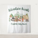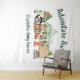 Uma lindíssima tapeçaria rustica de chá de fraldas bem-vinda, sinal de foto-fundo com uma ilustração aquática de animais da floresta com sua tenda e acampamento nas montanhas e na floresta e "Aventura Aguarda" e o nome da futura mãe em um roteiro verde de caçador negro.