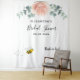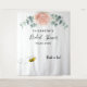 Elegante banner de chá de noiva em estilo clássico e moderno, tapeçaria. Decorado com uma grande peônia colorida à mão em rosa e dourado-rosa, flores e folhagens de eucalipto. Com o texto: Chá de Noiva escrito em um estilo moderno de letra à mão em preto. Personalize e adicione o nome da noiva e uma data. Uma abelha feliz e sorridente e o texto: Noiva bee!