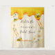 Tapeçaria divertida para chá de panela de verão. Fundo amarelo e branco com padrão de favo de mel. Com uma moldura geométrica em dourado falso. Decorada com flores tropicais amarelo claro e creme, hibiscos e alegres abelhões e mel dourado doce pingando. Com o texto: Noiva Abelha. Personalize e adicione o nome da noiva abelha. Pode ser usada como decoração de parede para o chá de panela ou como fundo para fotos.