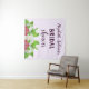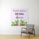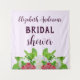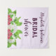 Chá de panela temático do jardim com dahlias brancas, framboesas e prigos de menta com tipografia roxa